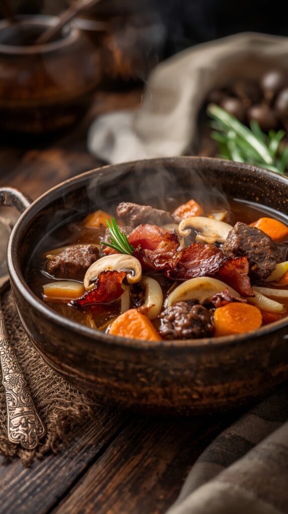 Warm up your kitchen with this rich and savory Beef & Bacon Mushroom Stew. Tender beef, smoky bacon, carrots, mushrooms, and aromatic rosemary simmer low and slow to create the ultimate comfort food. Perfect for cozy nights, meal prep, or family dinners.